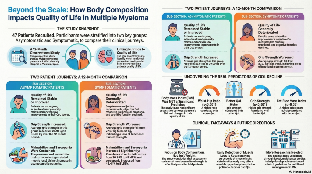 Additionally, while the technology we used (Bioimpedance and Dynamometry) is excellent for daily consultation due to its speed, there are more precise (though more costly and complex) methods available. Finally, treatments for Myeloma have evolved since we collected the first data; however, the biological basis remains the same: protecting your body composition will always be a safe investment, regardless of the treatment line or stage of the disease.